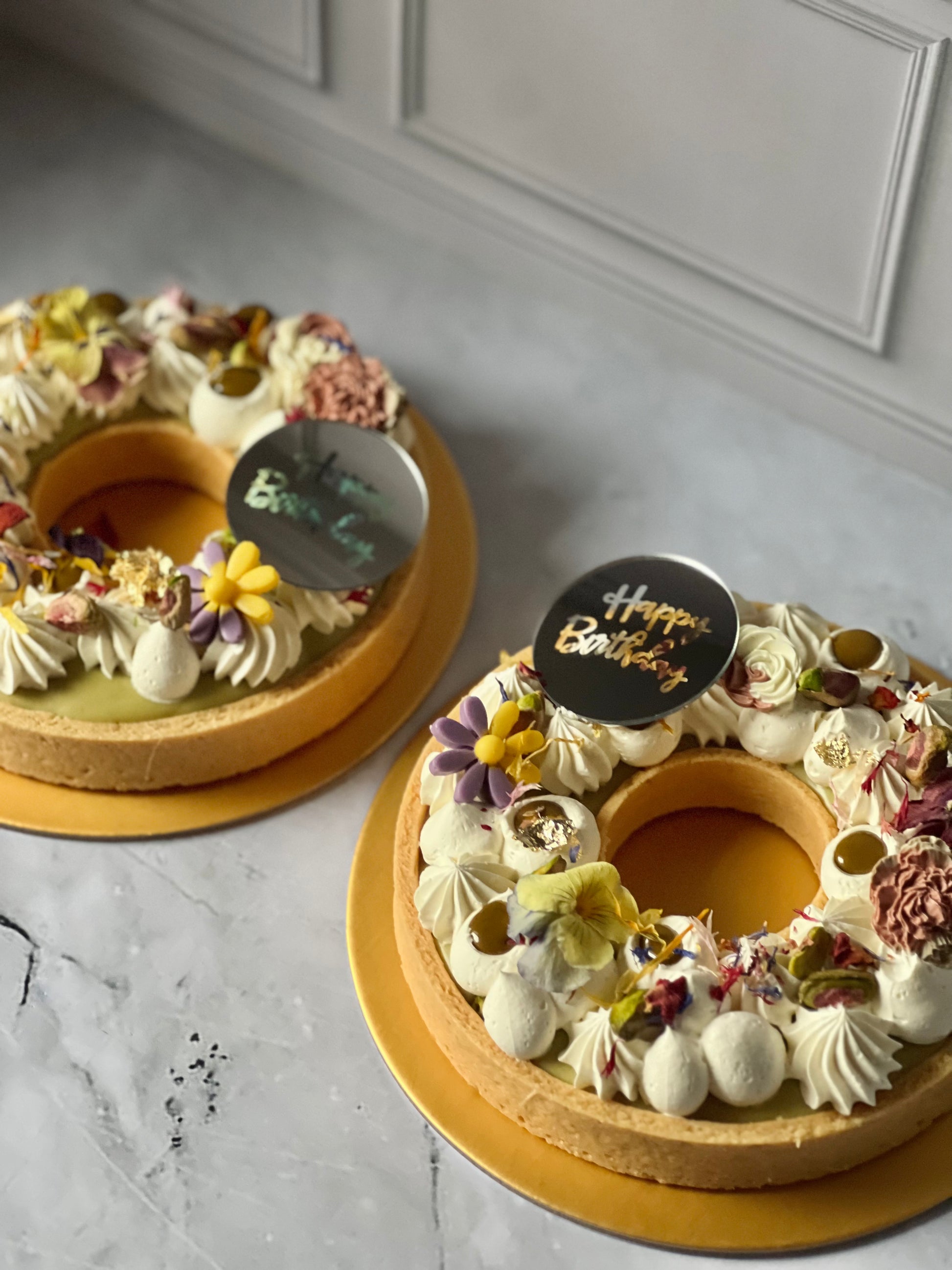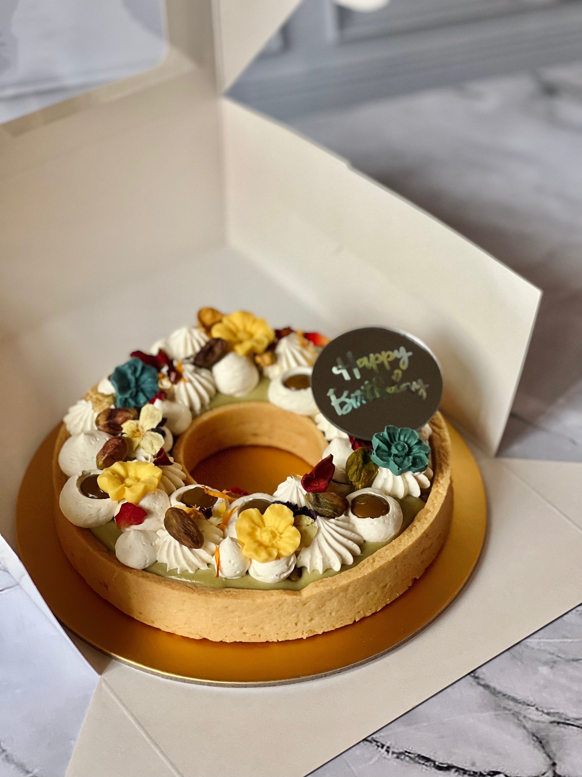 Every piece of the 6" Pistachio Dreams is unique in the way the choc pieces are arranged and handpicked. Trust us when we say we will make it a point to add our little signature and make it special for you or your recipient!