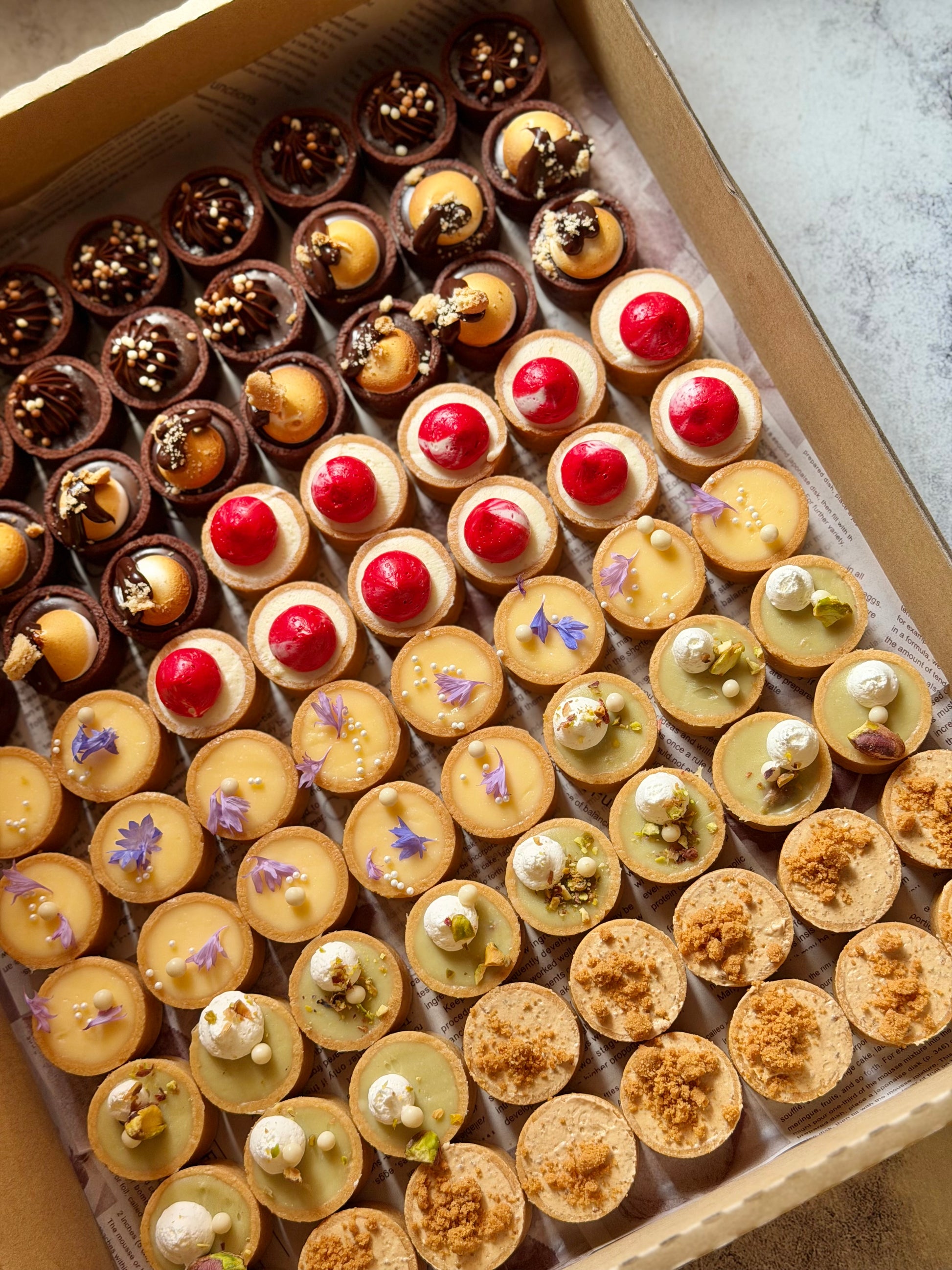 March tartlet flavours: Sea salt caramel chocolate, Hazelnut Feuilletine, Earl grey crunch, Pistachio, Keylime vanilla, Raspberry ripple cheesecake